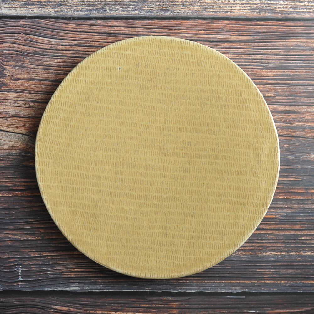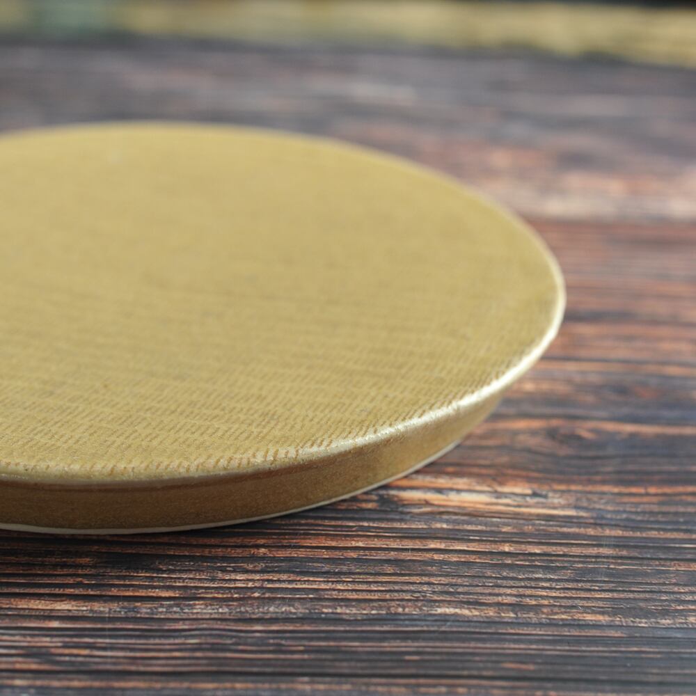 黄色の釉薬を使ったうてな皿は、ホールケーキやカップケーキ、パーティーに活躍しそうな器です。