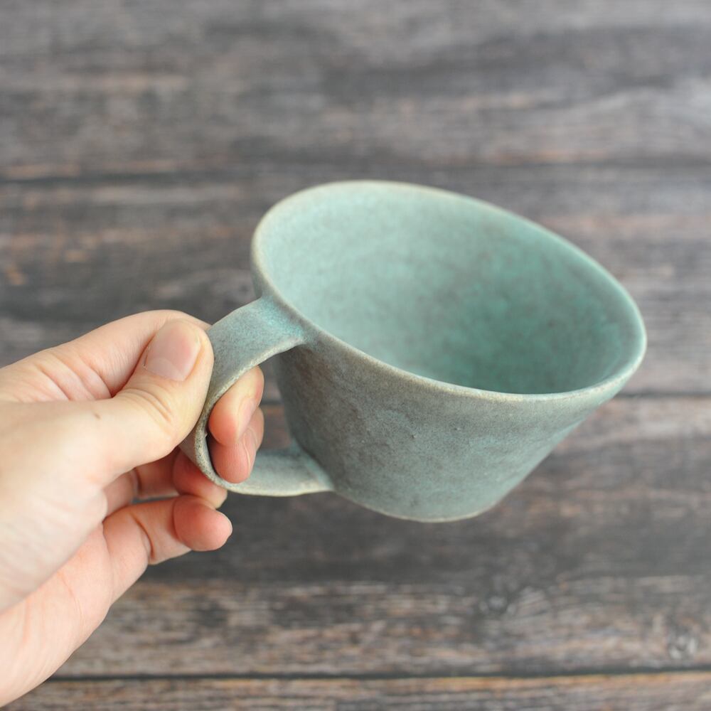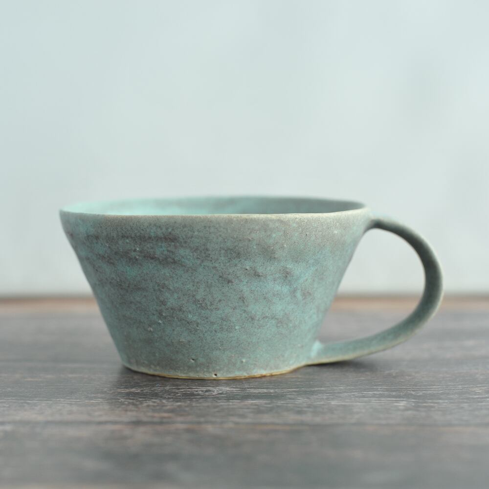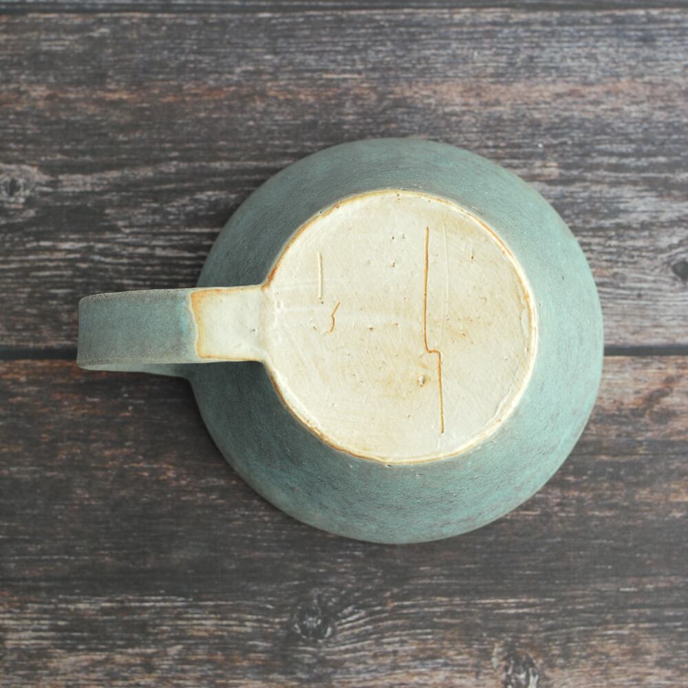 瀬戸内海を臨む、広島県の江田島にアトリエを構え活動している蓮尾寧子さんの【草原 スープカップ】は、やや飲み口が広めで、スープだけではなく、カフェオレや紅茶をいただくときにとっても使いやすい形の作品です。
